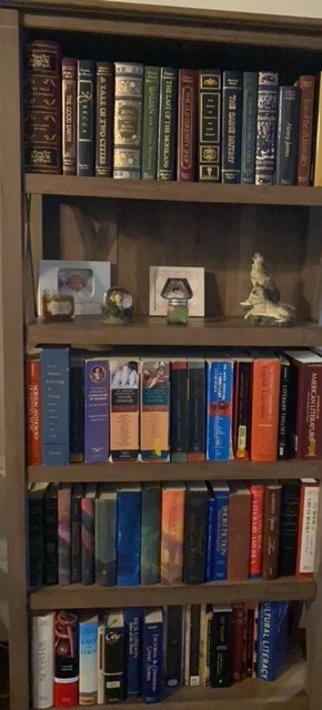 Oooh, this is a good question. I’m going to have to say the nicest cover is for my leatherbound Yale Shakespeare collection. This isn’t a very readable book. I’ve never actually read out of it because it could be used as a murder weapon if dropped from a certain height, but it’s more decorative and I keep it on the top shelf of my bookshelves with the other nicer books.